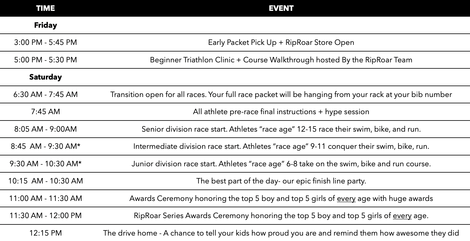We will have early packet pick-up the day before the event. Join us the Friday afternoon before the race to pick up your packet, check out your transition spot, and find some new RipRoar swag for the season. Packets will include a bike number, race bib, and $10 in RipRoar Rewards (use your RR Rewards for $10 off at the Merchandise tent.)